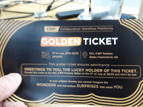 Also on Tuesday I was delighted to receive one of the “golden tickets” to HCL’s CWP factory in July. It’s going to be a fascinating and interesting event along the journey to Domino 10 and beyond.