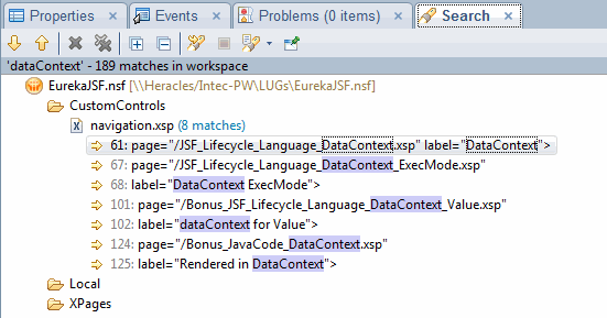 The search results allow you to navigate between results, remove one or all search results or expand / collapse search results. The final section allows you to run the search again, cancel a search or run previous searches. Double-clicking on a match will allow you to open the relevant design element. For standard notes Client design elements, these are opened as DXL. XPages and Custom Controls open to the source pane.